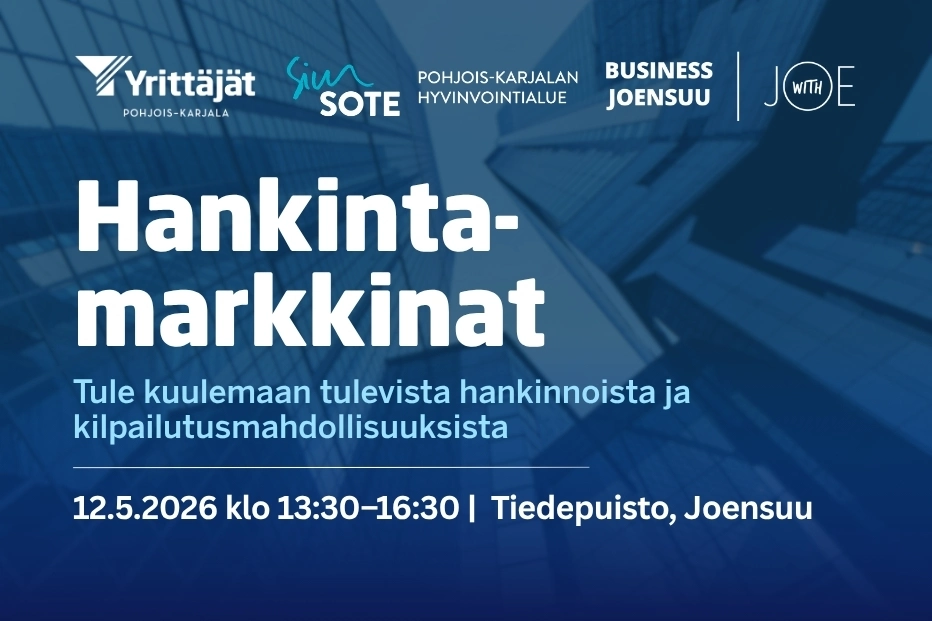 Hankintamarkkinat järjestävät Business Joensuu Oy, Pohjois-Karjalan hyvinvointialue ja Pohjois-Karjalan Yrittäjät. Ilmoittaudu mukaan viimeistään maanantaina 4.5. Lisätiedot ja ilmoittautumiseen liittyvät asiat p. 050 448 8468 tai joonas.hiltunen@yrittajat.fi.