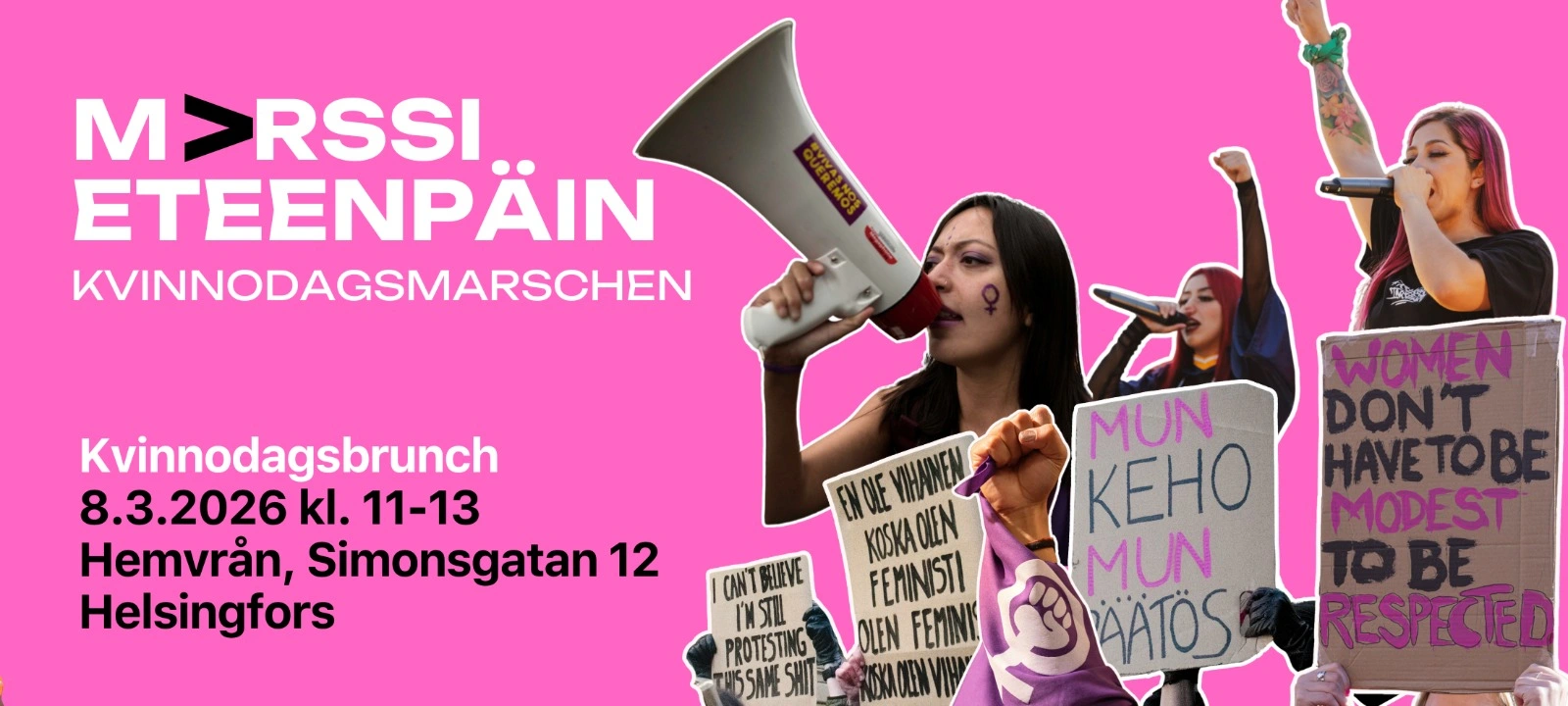 Välkommen på Svenska Kvinnoförbundets och Finlands svenska Marthaförbunds gemensamma kvinnodagsbrunch. Vi samlas och höjer stämningen inför kvinnodagsmarschen!