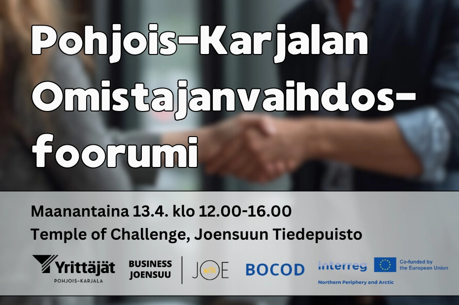 Omistajanvaihdokset ovat keskeinen osa yritysten jatkuvuutta ja alueen elinvoimaa. Pohjois-Karjalan Omistajanvaihdosfoorumi kokoaa yhteen yrittäjät, asiantuntijat, rahoittajat ja omistajanvaihdoksista kiinnostuneet kuulemaan ajankohtaisia näkökulmia, käytännön esimerkkejä sekä keskustelemaan tulevaisuuden mahdollisuuksista.