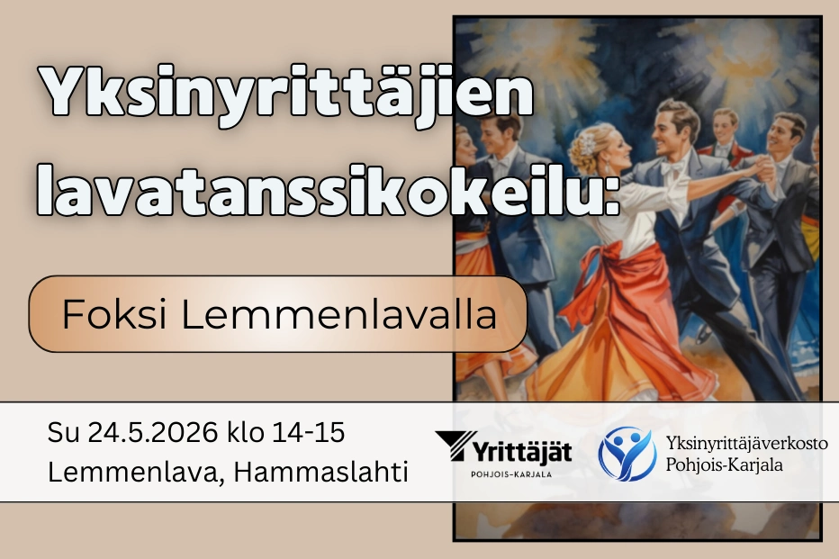 Pohjois-Karjalan Yrittäjien yksinyrittäjäverkosto järjestää matalan kynnyksen foksi-lavatanssikokeilun Lemmenlavalla Hammaslahdessa. Tunnin mittaisella kurssilla opetellaan foksiin liittyviä perusaskelia ja päästään kokeilemaan yhtä suosituimmista suomalaisista lavatansseista. Aiempaa tanssikokemusta ei tarvita, mukaan voi tulla yksin tai avecin kanssa.