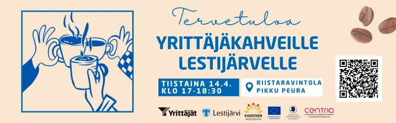 Keski-Pohjanmaan Yrittäjät kutsuu Lestijärven ja lähialueen yrittäjät Yrittäjäkahveille tiistaina 14.4.2026 klo 17.00–18.30. Tilaisuus on avoin kaikille yrittäjille.